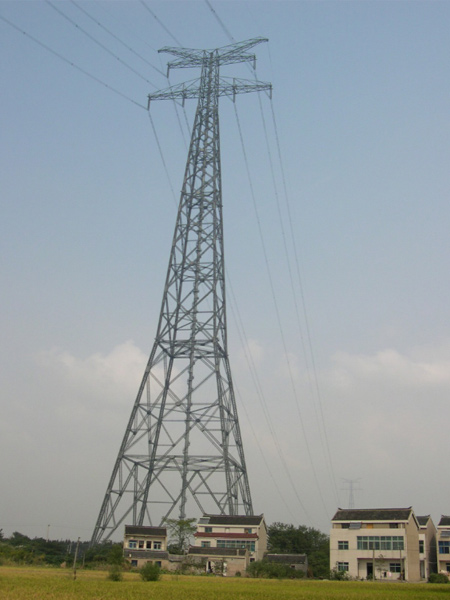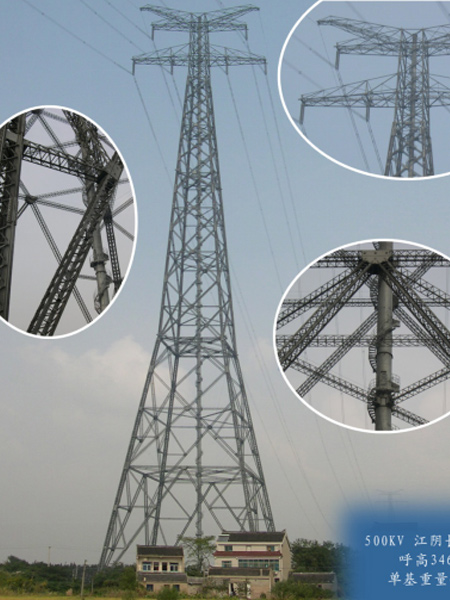 The 500KV Jiangyin Yangtze River GreatCrossing Project has one of the highest 500KVangle steel transmission line tower. The total heightof the crossing tower is 346.5 meters, the span is2,303 meters, and the total length of the cross armis 77 meters, and the distance between two legs is68 meters. It is 20 meters higher than the famousEiffel Tower. With light structure and beautifullooking, the whole tower weighs about 4,000 tons. In2000, more than ten internationally renownedenterprises participated in the bidding for theJiangyin Crossing Steel Tower loaned by the WorldBank, and CSTC won the bid. Our companysuccessfully produced the four anchor towers andcooperated with the Jiangnan Shipyard to processthe two crossing towers.